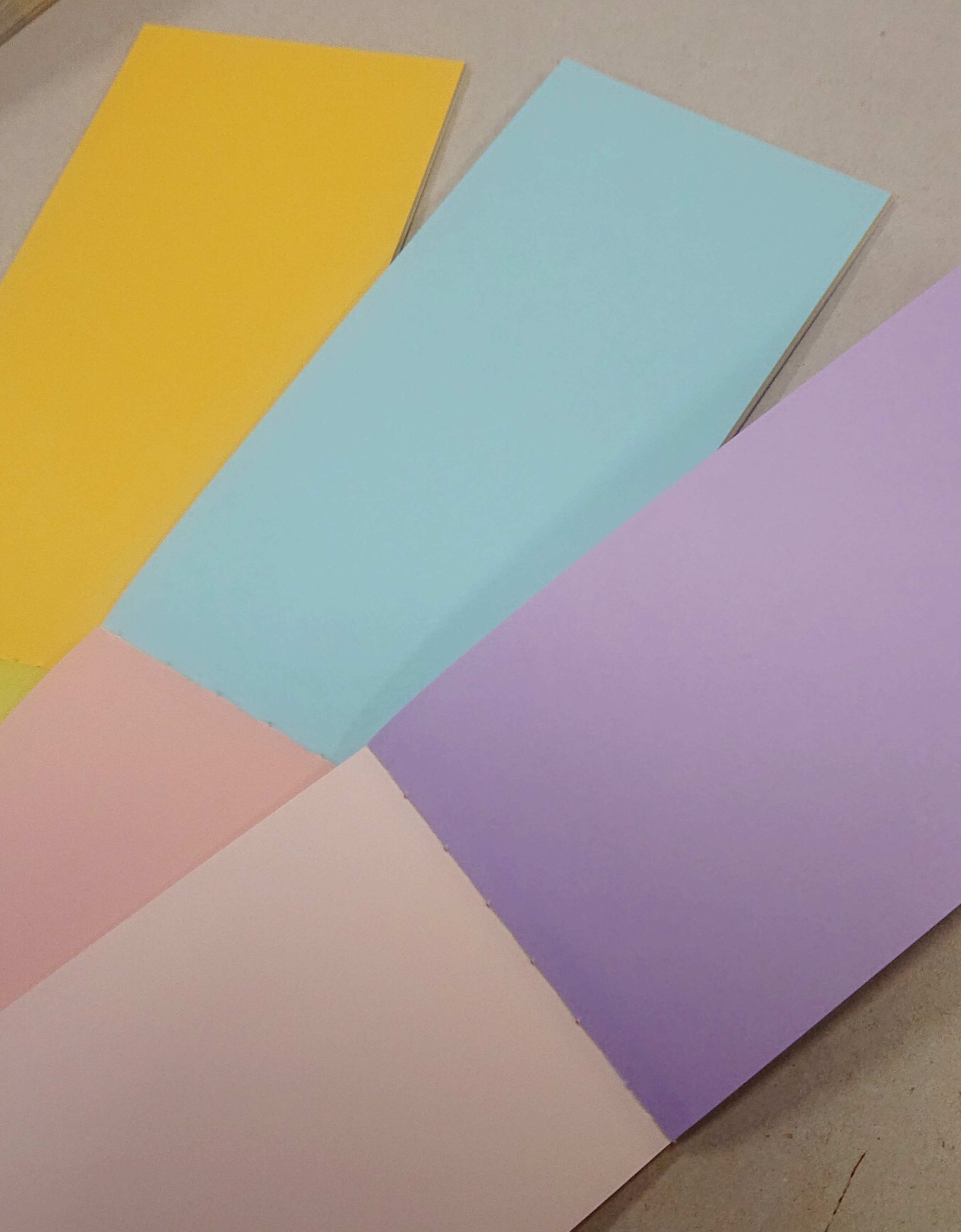 次に、無線綴じと言われる用紙を重ね背の部分を糊で固めたノートや教科書に使われる製本方法で、用紙は印刷した時の廃材を再利用したいと考え本来は処分する色紙を使用。