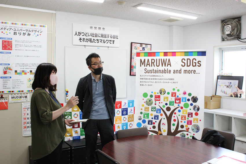 当日は、まず社員のアテンドで社内を案内させていただき、各部署の責任者から実際の業務とSDGsの活動を各所にあるSDGsのマークの入った掲示板やサインも見ていただきながら見学していただきました。