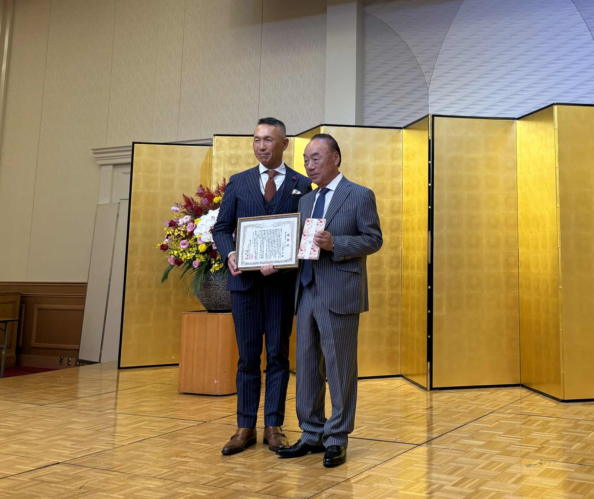 社長から40周年の感謝状を会長が受け取る冒頭の写真
