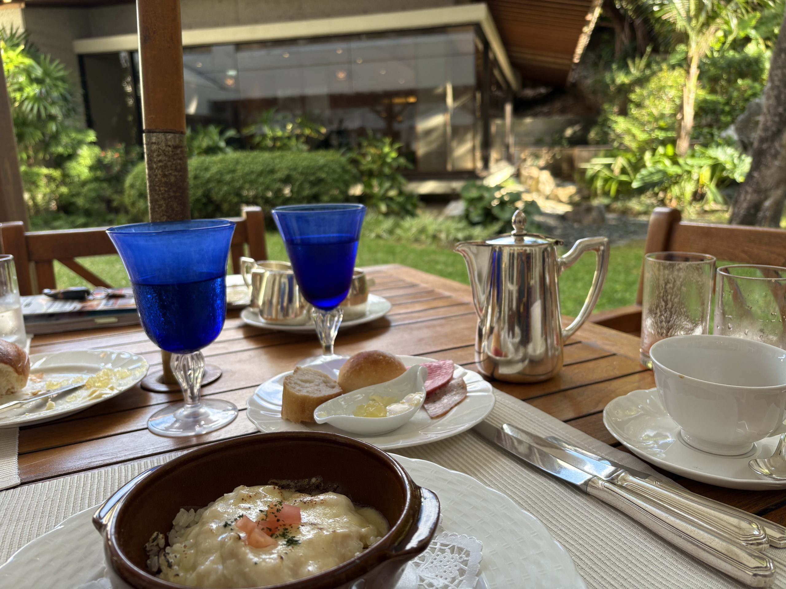 朝食は庭を愛でながら食事